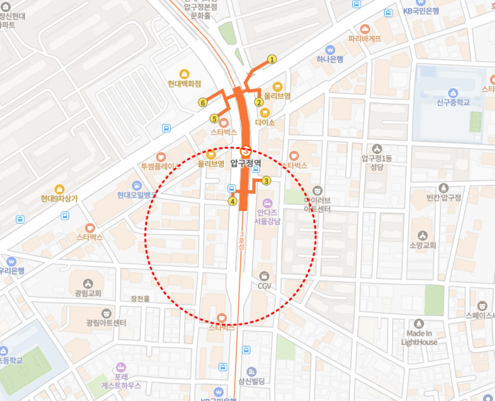 - 압구정역에서 도보 2분거리의 접근성 좋은 이면에 위치