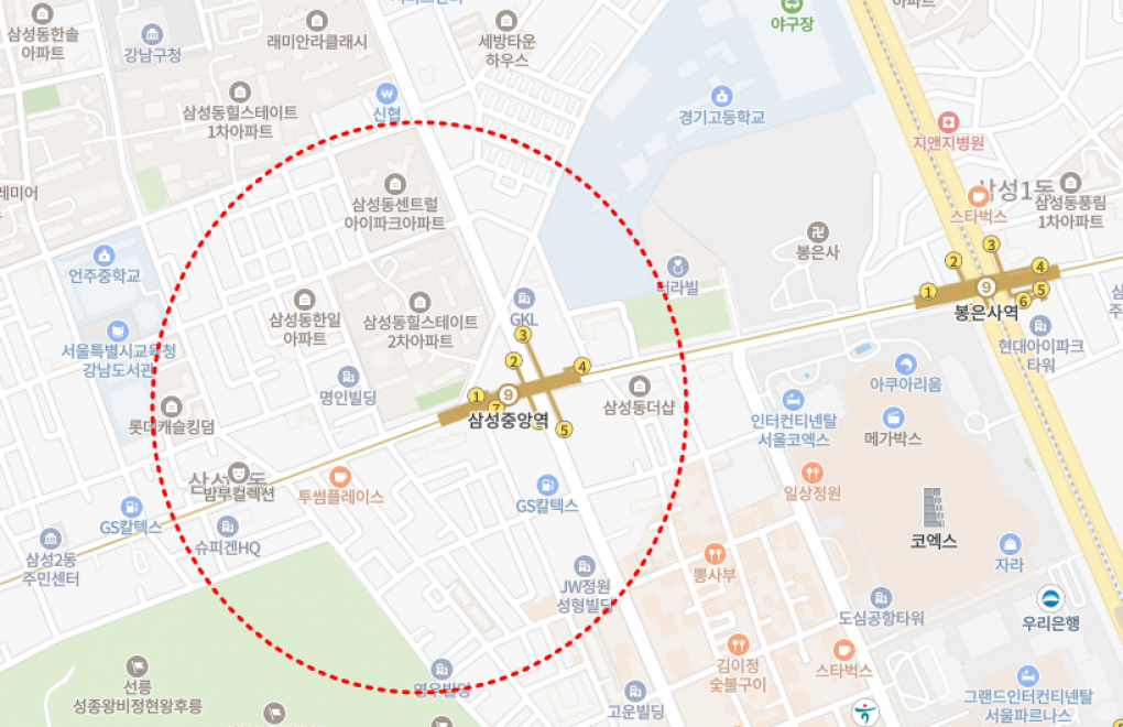 - 주변에 많은 오피스 건물이 있어 직장인 대상의 오피스 상권일 뿐 아니라 코엑스, 현대백화점, 호텔 등 문화, 예술, 엔터시설도 함께 발달된 고급스럽고 특색있는 복합 상권의 입지